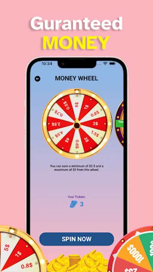 ✔ Money Wheel: Collect tickets and spin the money wheel. You can earn a minimum of $0.3 and a maximum of $5 in each spin.