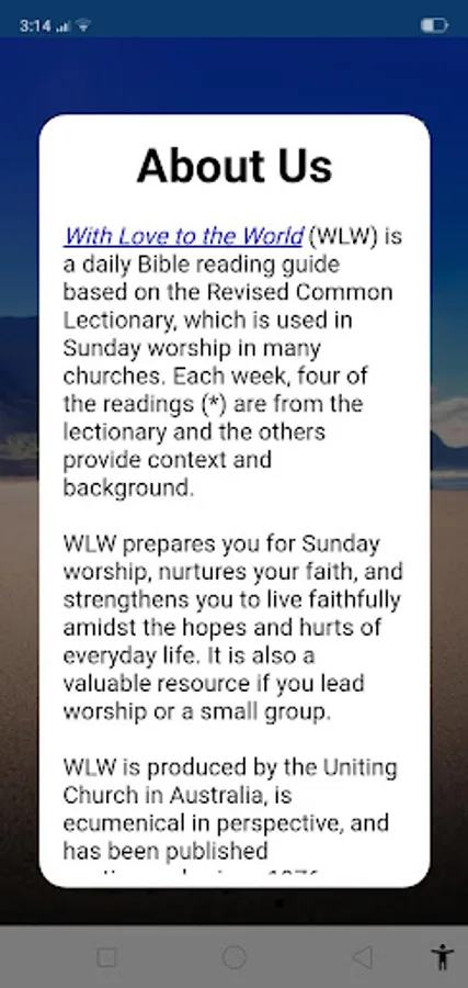 With Love to the World (WLW) is a daily Bible reading guide based on the Revised Common Lectionary, which is used for Sunday worship in many churches. WLW prepares you for Sunday worship, nurtures your faith, and strengthens you to live faithfully amidst the hopes and hurts of everyday life. It is also a valuable resource for worship and small group leaders. Produced by the Uniting Church in Australia, WLW is ecumenical in perspective, and has been published continuously since 1976. It is written by a team of people well trained in biblical studies and theology, and with pastoral experience.
