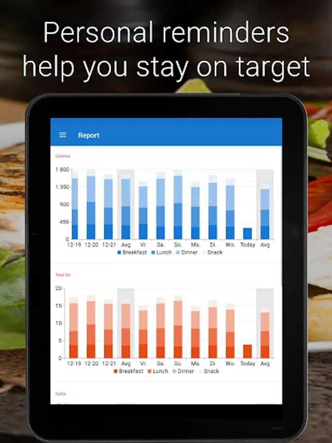 7. Daily reports: Using the menu, you can directly open the diary, which shows a summary of your day. Here you can switch between calories, protein and carbohydrates by pressing on little triangle.