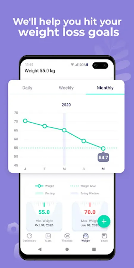 See how intermittent fasting diet influences your weight and track your progress in a smart timeline. You can attach photos, health and mood notes to see the qualitative dynamics of your fasting journey too!