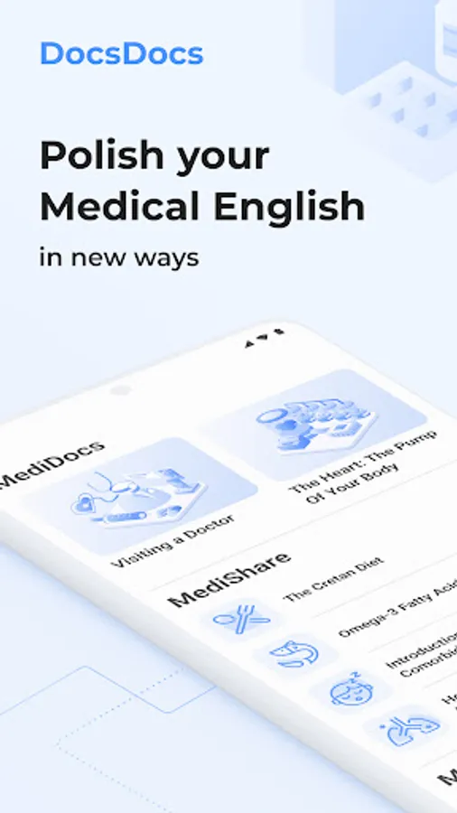Docsdocs is the first user-friendly App to learn medical or nursing English and especially designed for non-English speakers.