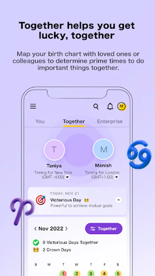 Together: map your birth chart with loved ones/colleagues for prime times like Victorious Days or not so auspicious times like Airplane Mode Days.