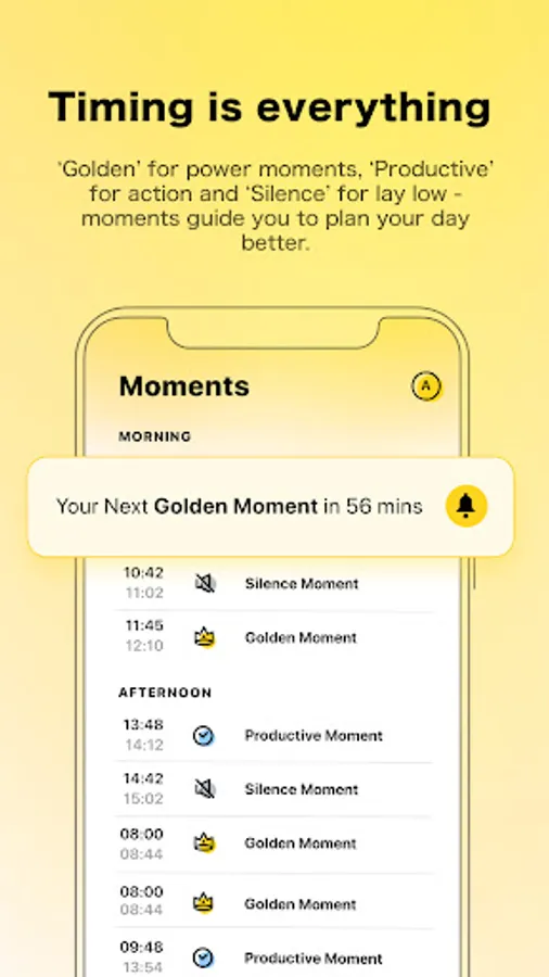 Moments: ‘Golden’ for power moments, ‘Productive’ for action and ‘Silence’ for lay low.