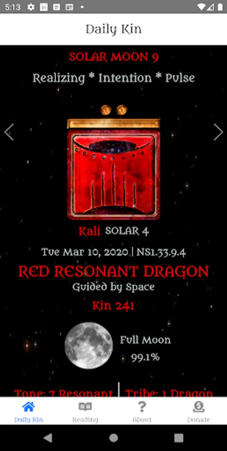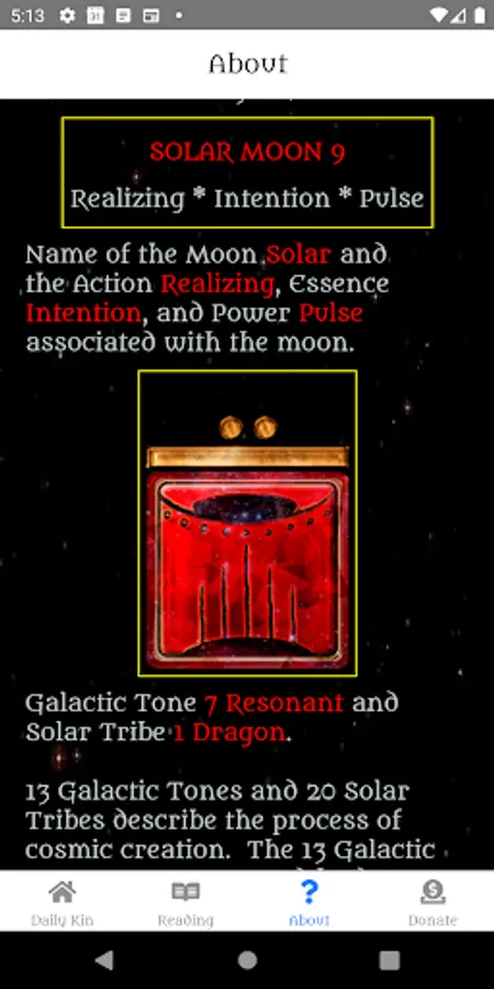 When you open the app, it shows all information for each day's Kin, which is a unique and special day in the 13 moon calendar. Especially powerful is the beautiful Solar Tribe symbol displayed for each Kin. The current moon phase is shown, and even a daily reading! You can swipe the screen to see previous and future Kin's, and the About tab will break down each day's Kin and explain the information thoroughly.