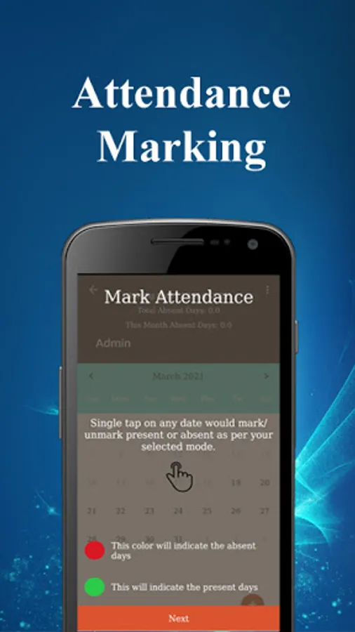The app is simple to operate. All you need is to enter the name of the person and its role. On the basis of frequency in the occurrence of event, you can mark either present or absent on the dates of their corresponding availability or unavailability. If you wish to update your preference from present to absent or vice-versa, it will delete all your events and marked attendance for selected month.