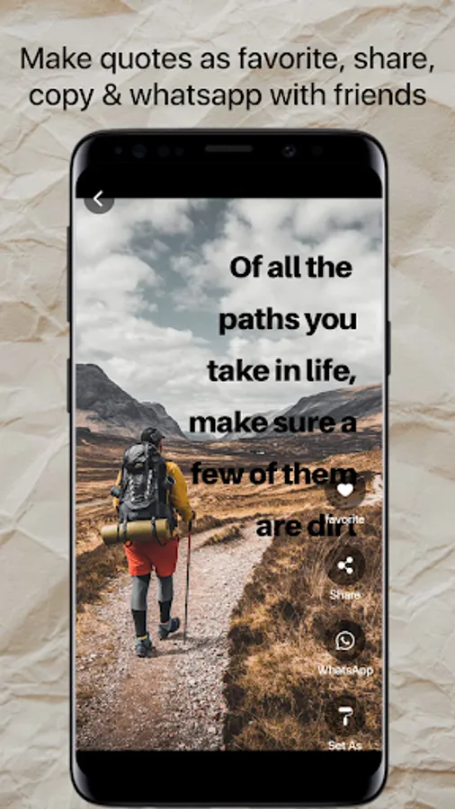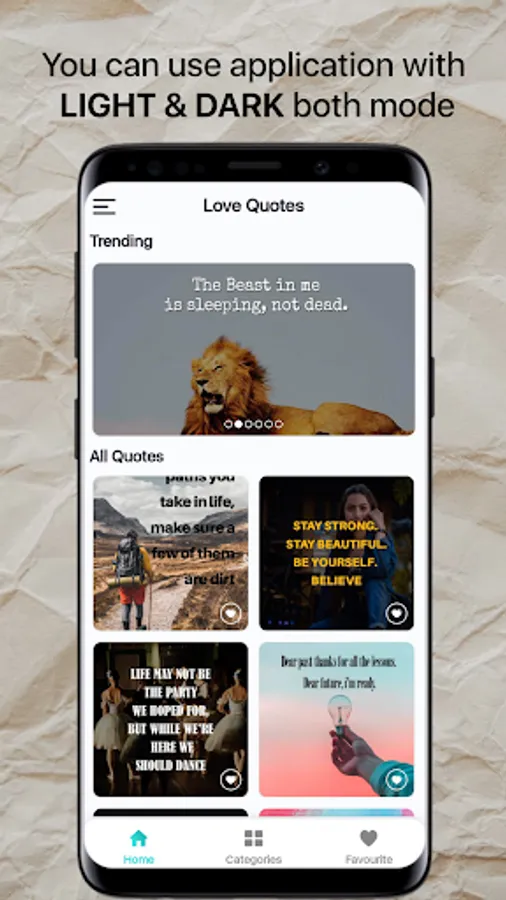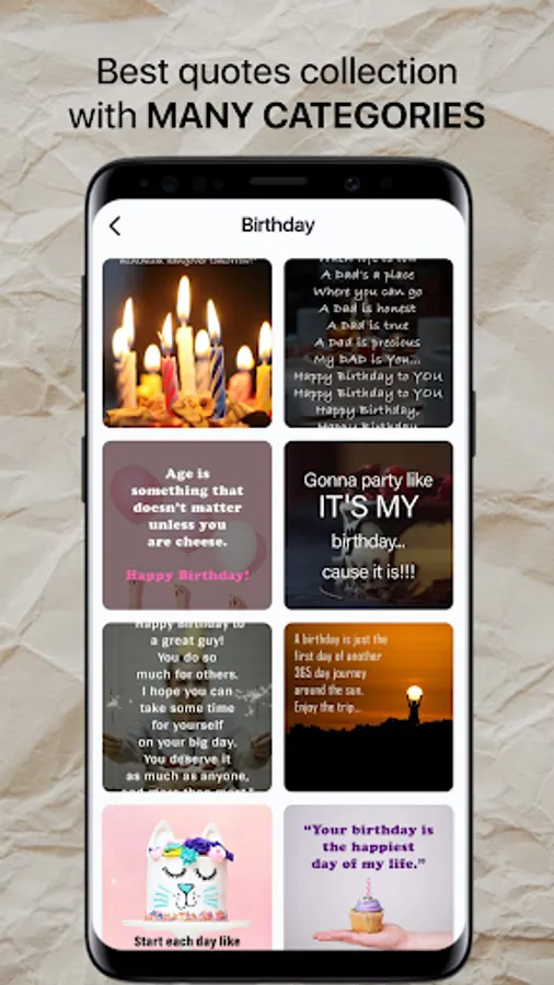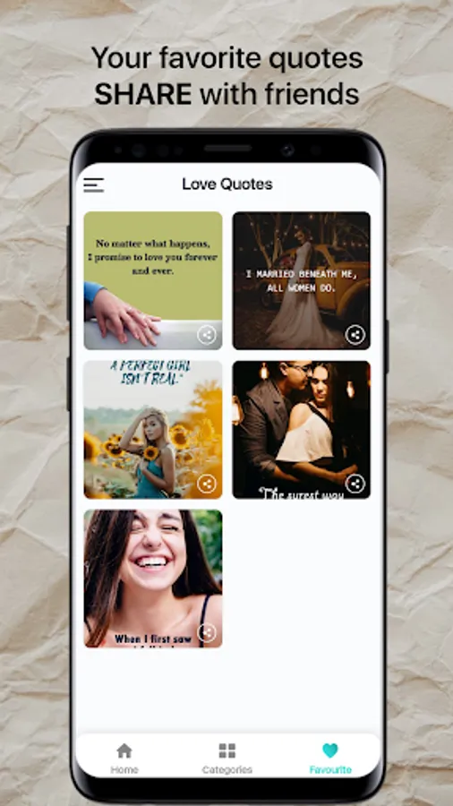 En tapant sur les catégories, vous obtenez une liste de citations que vous pouvez enregistrer, copier , partager,créer vos propres citations immédiatement sous forme de texte.