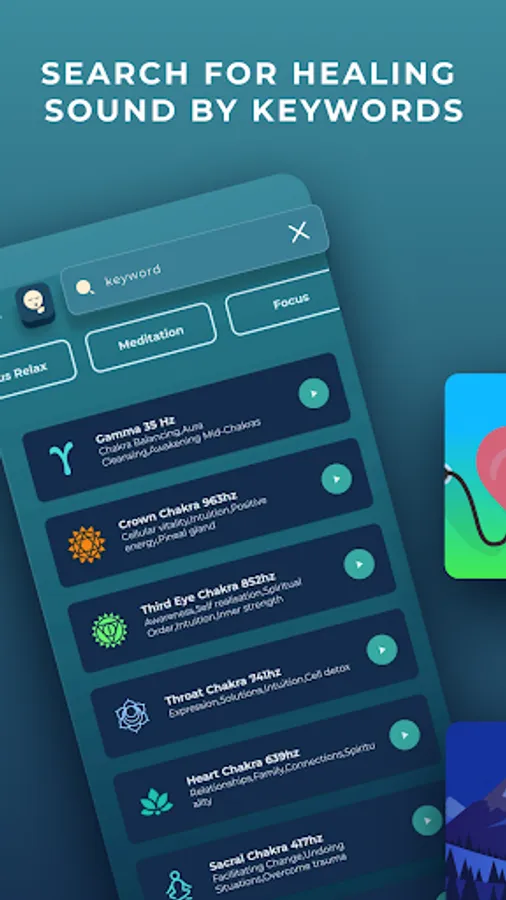 Heal your mind and soul with transcendent sounds waves with healing frequency in our Sound Therapy app. Listen to binaural beats, solfeggio frequencies, meditation sounds, and more. If you’ve never heard about healing sound therapy, this is the perfect place to try. We have popular relaxing sounds such as nature sounds or music for yoga. We also have more specialized sound waves for therapy such as solfeggio frequencies, Tibetan Signing Bowl, Ohm Meditation Mantra, Binaural Beats and so much more!