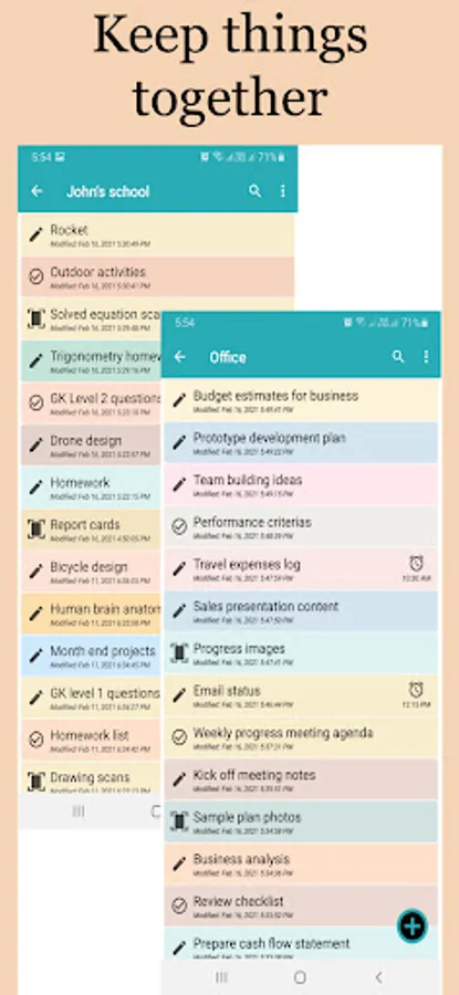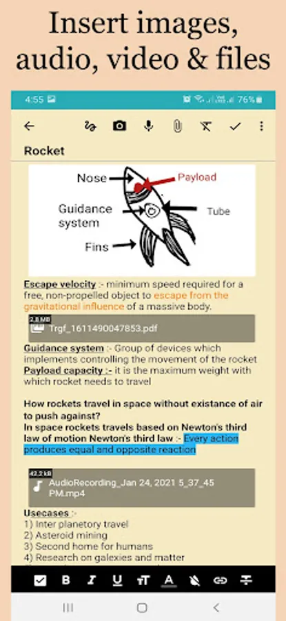 ποΈ Notes : Take notes with rich text and insert images, record video or audio and insert drawing, paint, PDF or any file attachment, assign color, use rich text editor, word format options like bold, italic, underline, font color, background color, strike.