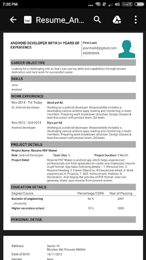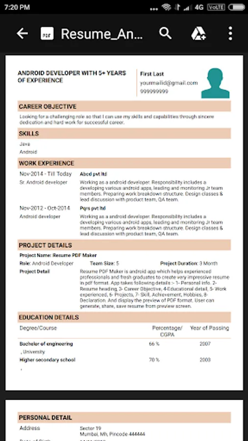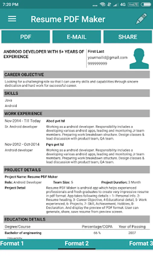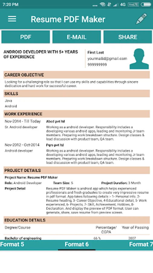 Resume is first impression while job hunting. Resume PDF Maker app will help you to create, make, edit, share professional format resumes in pdf format quickly. Professional looking resume is a must have when you apply for any job, going for an interview, job hunting, job search, applying for jobs on job site etc.