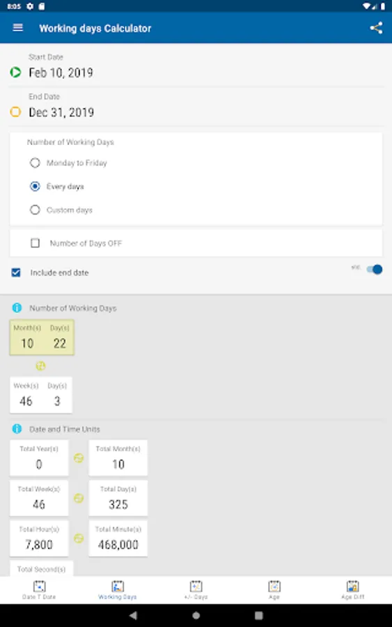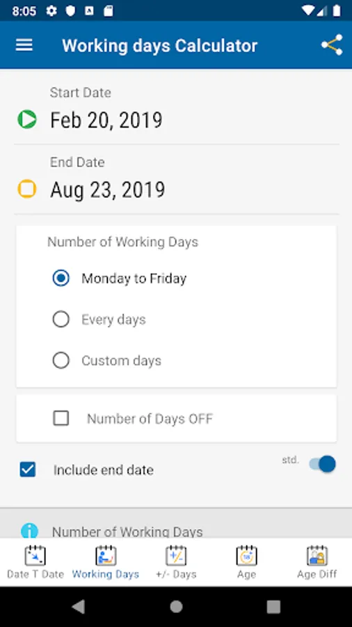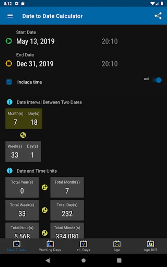 Finding difficulty calculating the number of working days or number of days between two days? It's time to make this simple calculation, even more, simpler with "Date Calculator" app. In just one click you can easily calculate the difference between to dates or calculate the number of working days. The app is very useful and helps you in estimating your plans. You can also calculate the exact difference accurate up to minutes. The "Date Calculator" is just awesome with Dates.