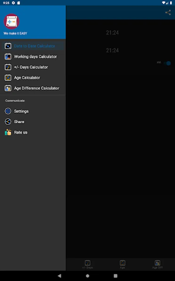 The "Date Calculator" app is very easy to use with a simple user interface and intuitive touch mode controls, also have Dark theme and Light theme to choose. With Date Calculator in your device, you can easily play around with dates. Add, Subtract two dates or add the number of days to dates, the app supports all kinds of calculation related to dates. You will surely be amazed to see the accurate results. The app is very useful for day-to-day life activity at the office, housing chores or at schools. Quickly find the number of working days left or the number of working days between two dates.! Its all in just one click.