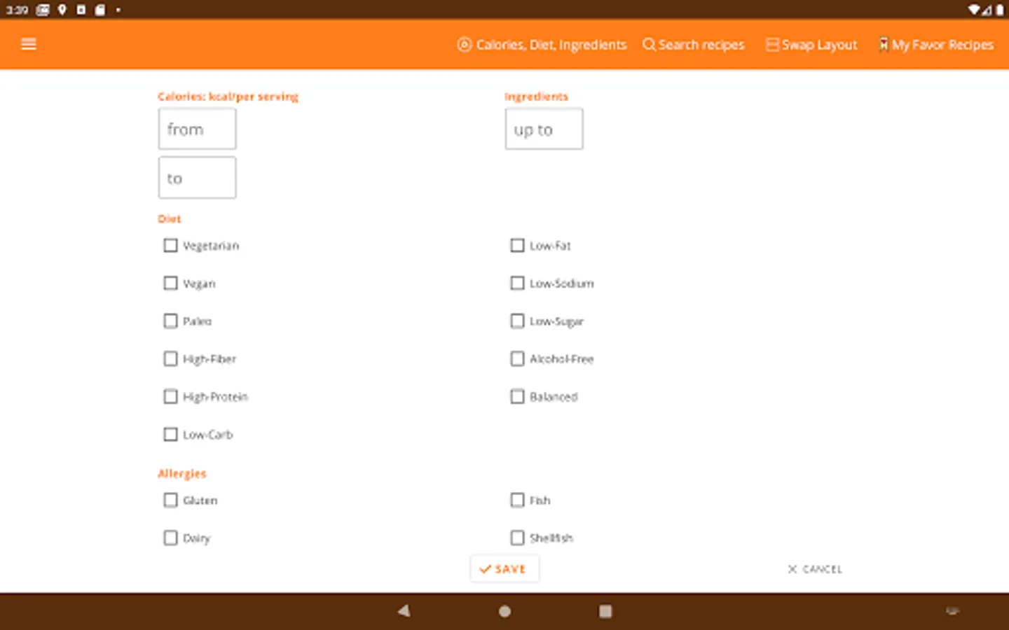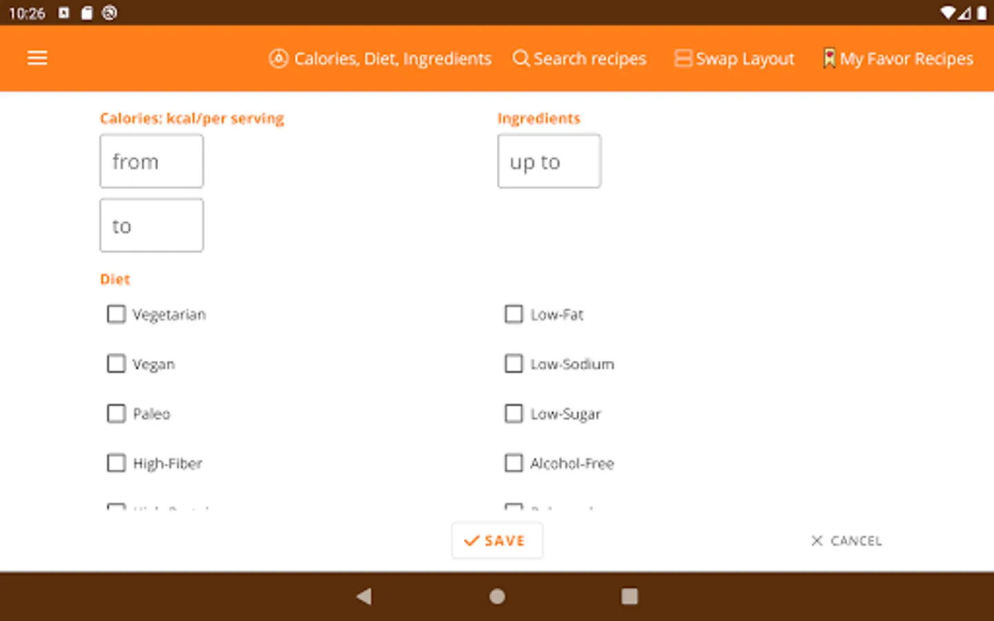 3. Set diet for Vegetarian, Low-Fat, Vegan, Low-Sodium, Paleo, Low-Sugar, High-Fiber, Alcohol-Free, High-Protein, Balanced, Low-Carb