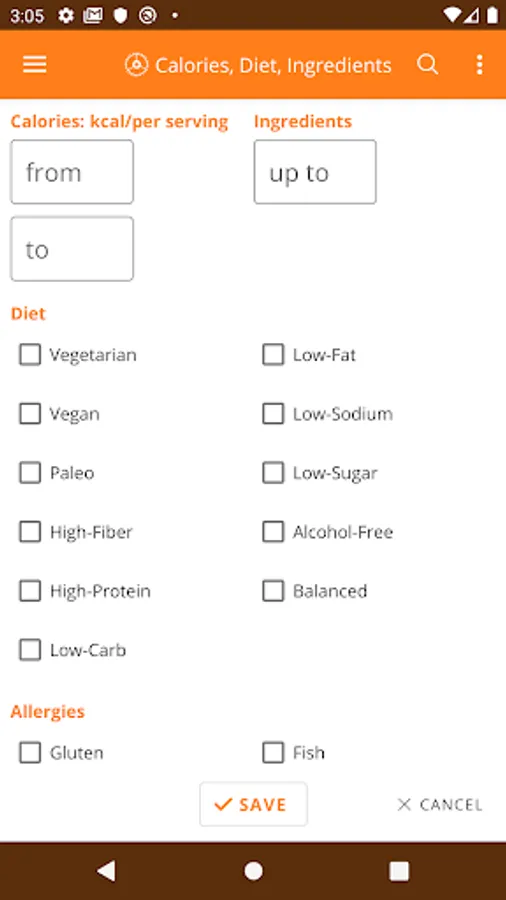 Filter by calories, diet or allergy restrictions