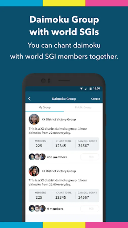 You can simultaneously chant daimoku with world wide SGI members together, with more than thousands members by daimoku group function.