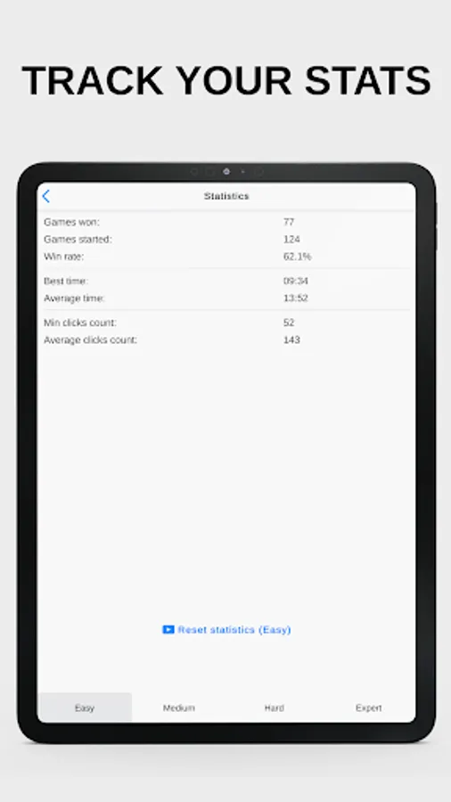 • The game is recording statistics. Track your progress on each difficulty level: analyze the best time, win rate and other indicators.