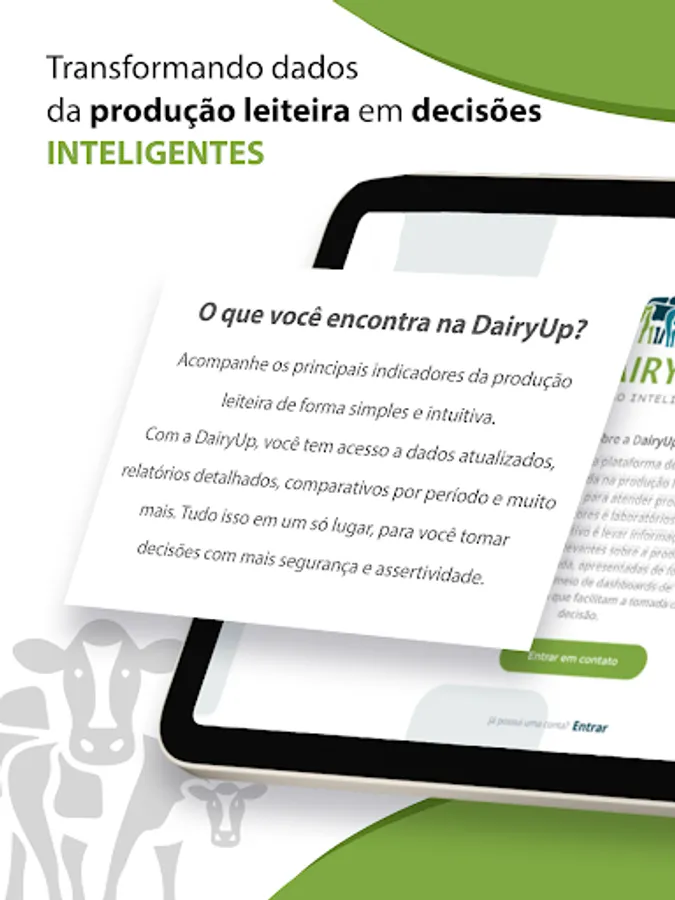 Dairy Up is the ideal application for dairy producers looking for more control, efficiency and productivity in herd management. With it, it is possible to record essential information about milk production, health, reproduction and feeding of animals, in a practical and intuitive way.