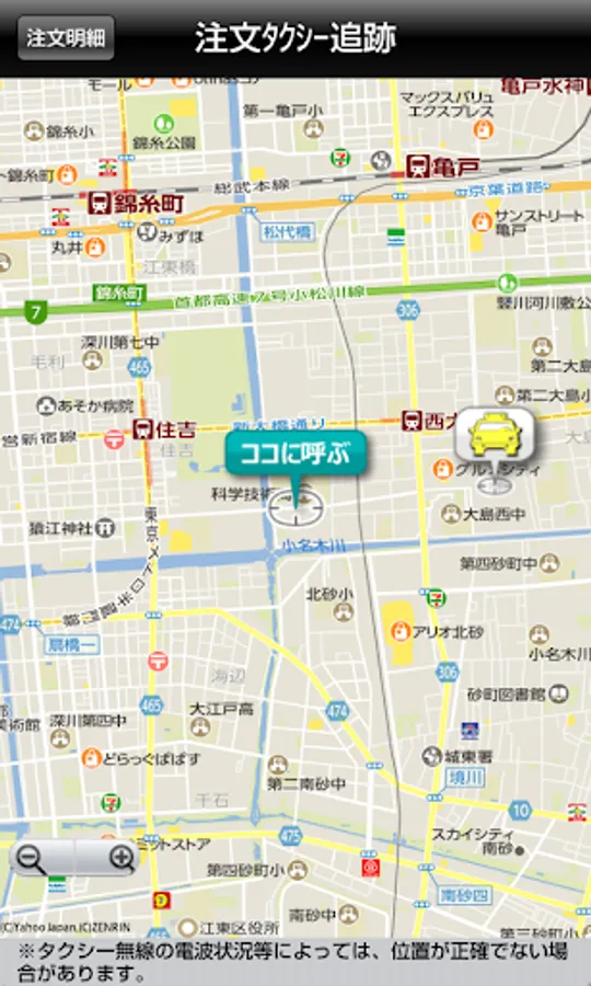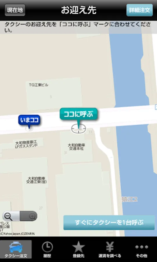 1. Using the map, you can specify a taxi pick-up destination. Tokyo's 23 wards and Musashino City, you can order from Mitaka City.