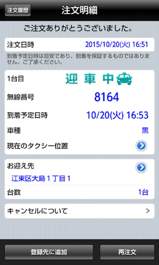 3. If the taxi is called one, and [immediately taxi is called a single to] the button, the number, if you want to specify a taxi with location, please press the [order details] button.