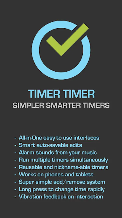 Timer applications out there are more complex than they need to be, requiring too many touches and swipes. They lack attention to detail and a beautiful aesthetic. I set out to create something better. Something that is both simple and functional. Something that is enhanced through a smart and clean design. Something intuitive with practical style. That something is Timer Timer.