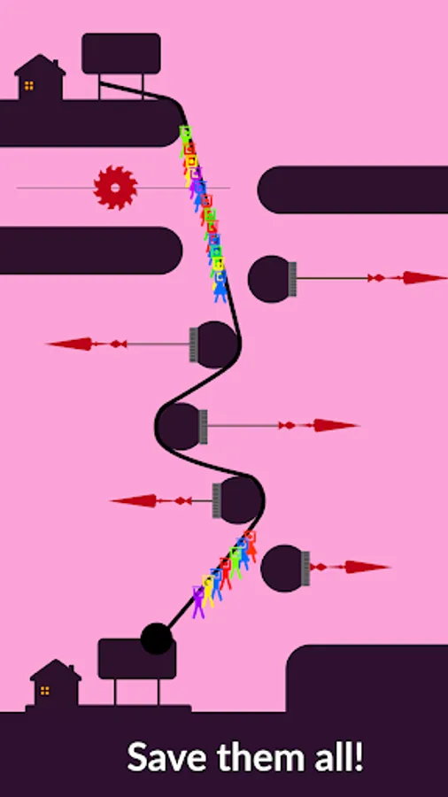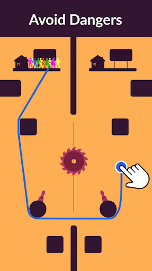 To rescue the friends waiting at the starting point of this dangerous valley, draw a line with your fingers and after reaching the other home, tap on the screen to let the passengers go on the zip line. How long you hold your finger on the screen, the more passengers do zip line. To avoid the dangers, you can draw the line around the blocks, you can move the line just like a rope. The game mechanic is based on whipping a rope.