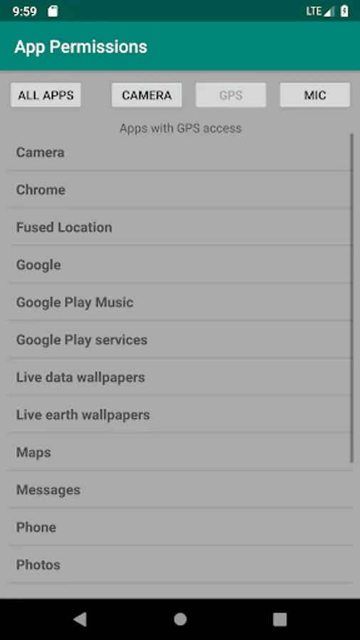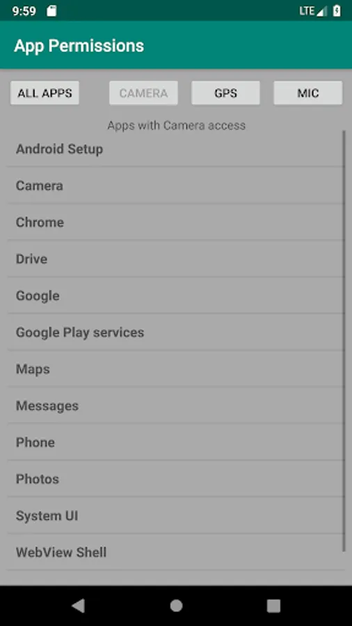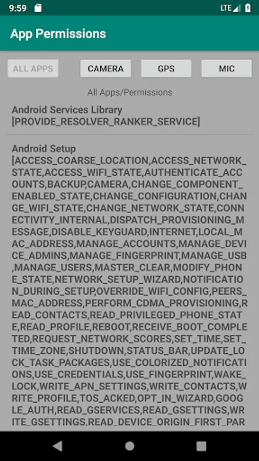 Have you ever wondered which apps are spying on you, using your microphone, camera, or GPS? Me too. So I made an app to easily list all apps, along with their permissions. You can also quickly view a list of apps that have access to the microphone, camera, or GPS.