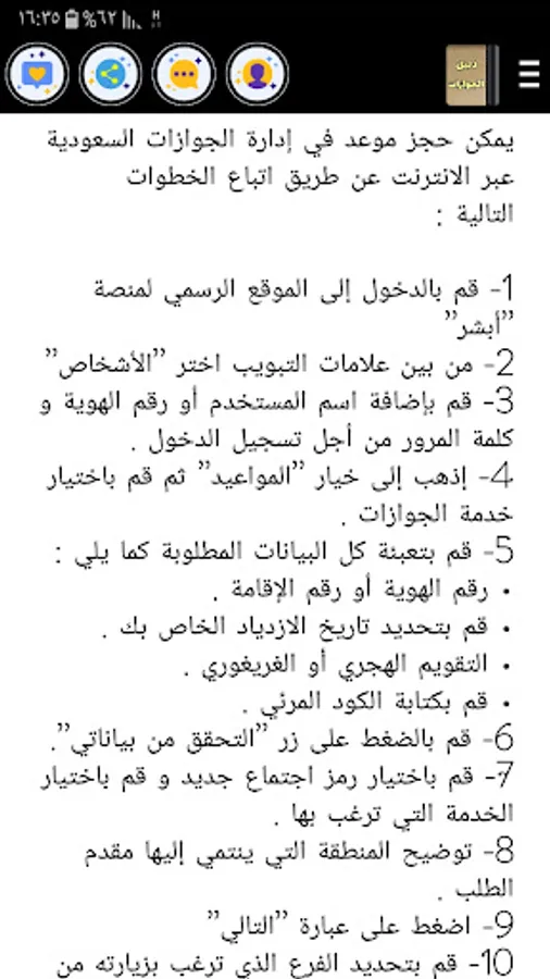 As for the passport program, it is a guide for citizens interested in passport and immigration services, as it answers the most important questions about the passport authority, as it provides information about passport appointments and information about the passport communication service, in addition to explaining an inquiry about a person with the national number And information about inquiring about an expatriate, and it also puts in the hands of users information about the validity of residency.