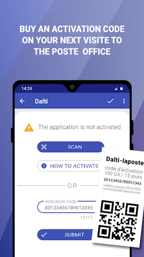 ❌ You have to buy an activation code (for only 100 DZD) from our selling points near any supported poste office before using the application. In a future update we will also support e-payment by PayPal and "Edahabia" card.
