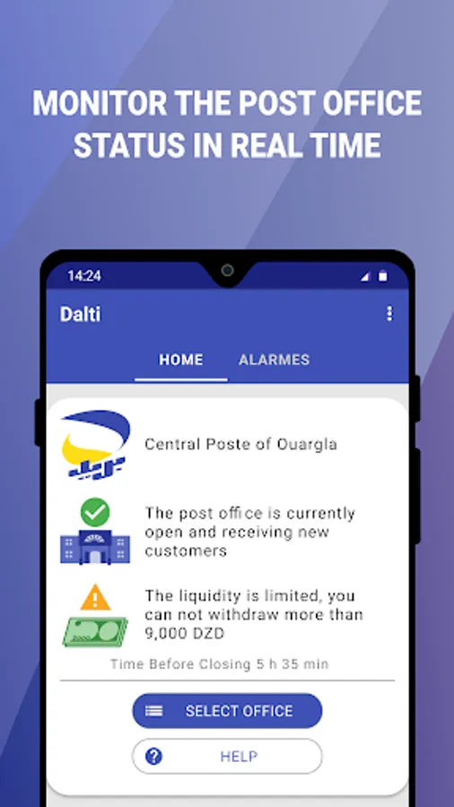 Dalti-laposte will keep you updated about the poste office status in real time in adition to sending notifications when your turn is near, this will enable you to invest your wiating time in a more productive tasks than just setting until your turn will come.