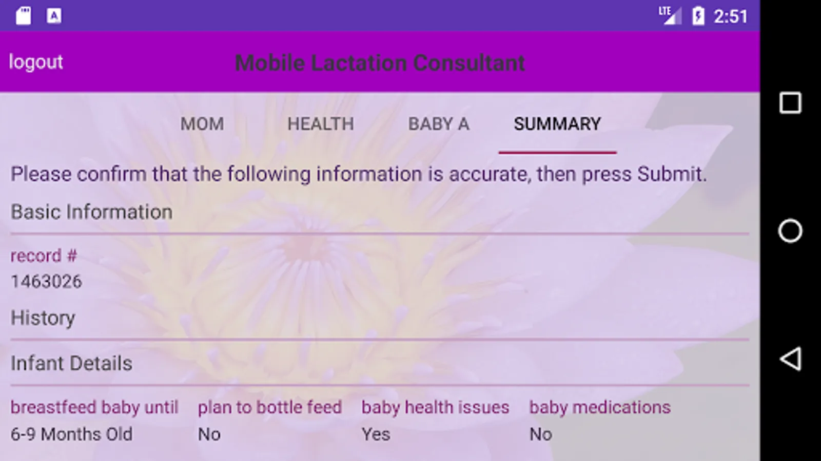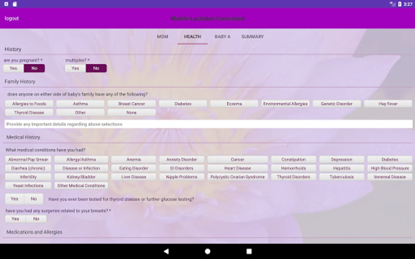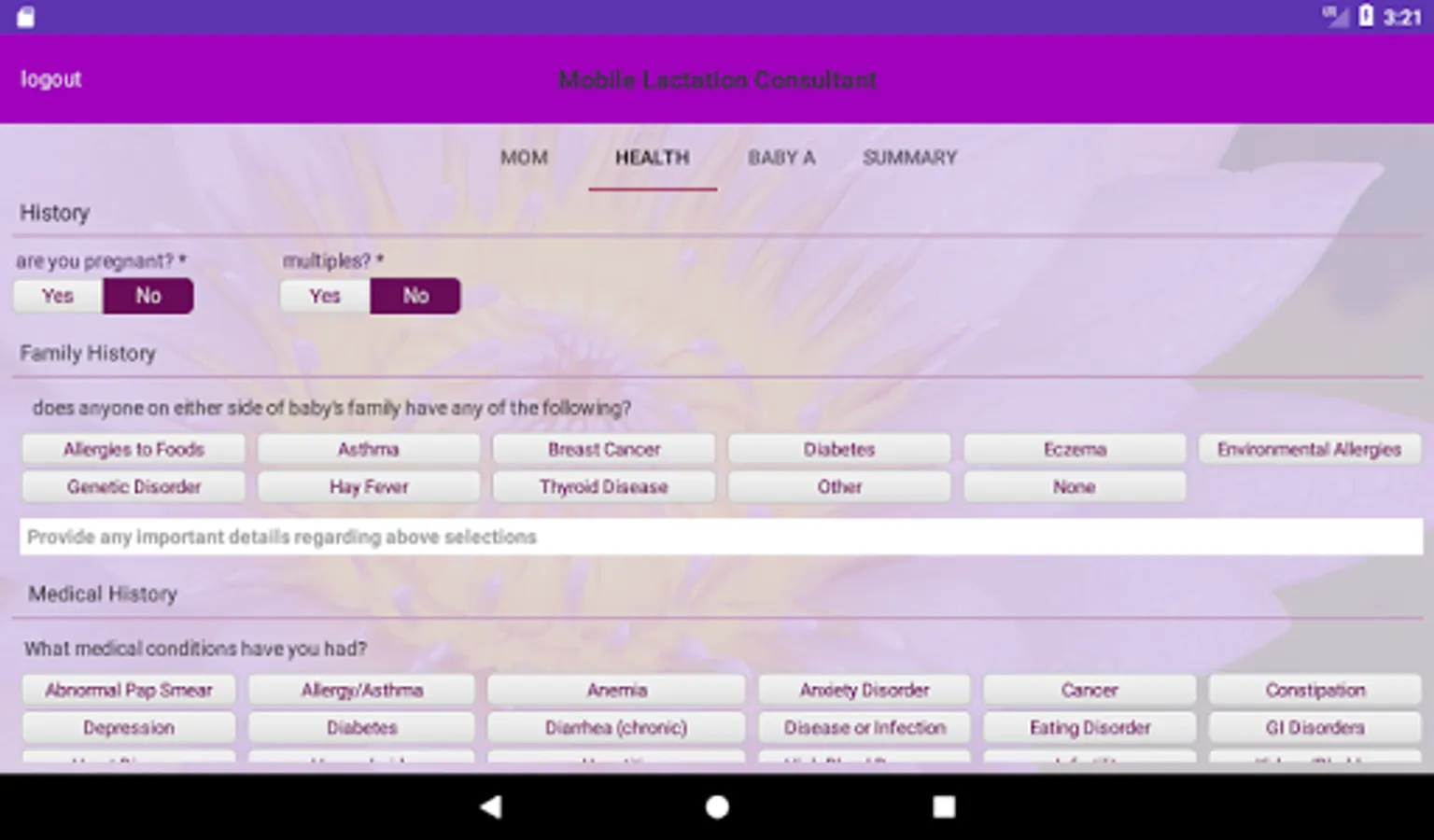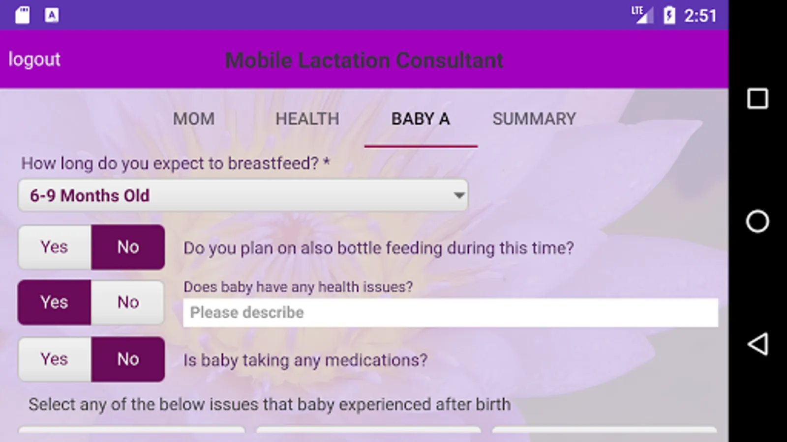 Mobile Lactation Consultant is the premier electronic charting and patient health records software for Lactation Consultants. Client's use this portal to fill out their health history, sign documents and even message or chat with their provider. Please visit our website to learn about the main Mobile Lactation Consultant charting app.