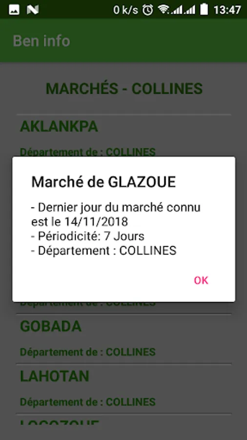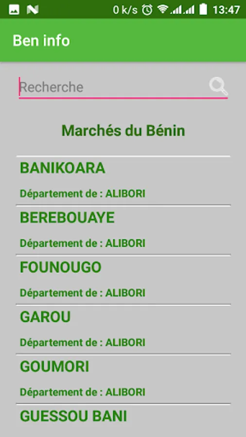 Ben Info is an application to know the market day of about 185 Beninese markets. This application makes it possible to keep users informed about developments and progress in the agricultural world and allows them to inform the authority about a possible threat with an image in support