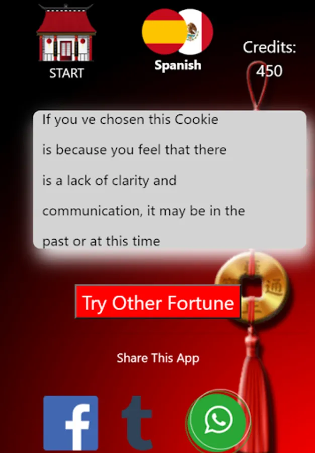 The Chinese fortune cookie app free for your smartphone and tablet. This app has more 1000 messages, advices, recommendation and phrases for your fortune for today.