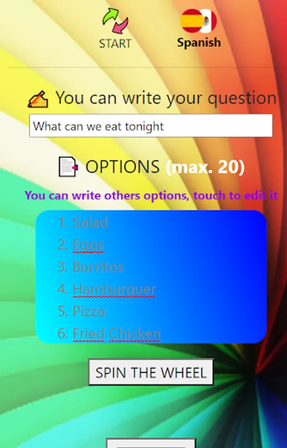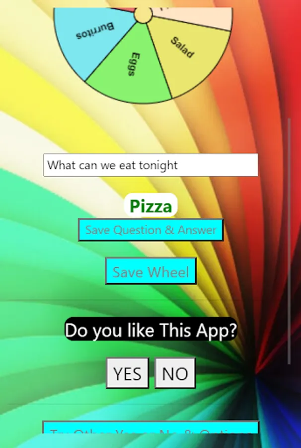 Wheel spinning app have 4 methods that gives you instant answer yes or no wheel as a oracle and customize answers and custom spinner, you can obtain random answer as fortune game online or food decision maker.