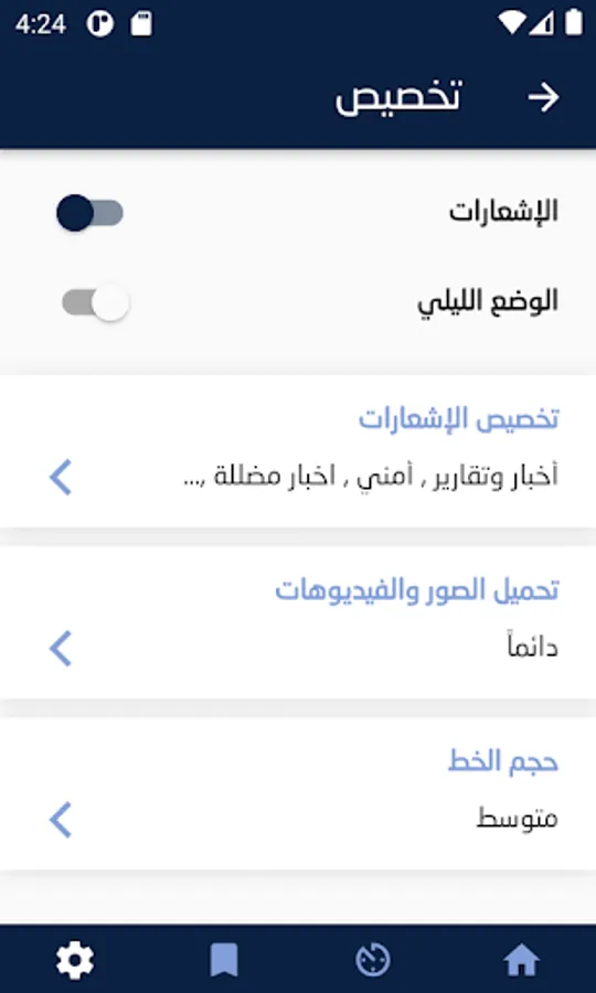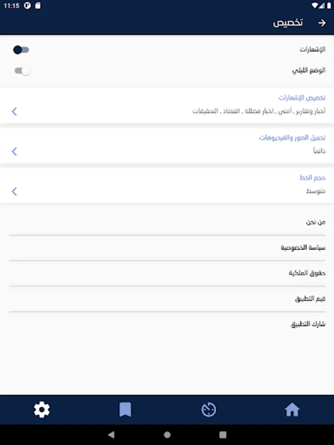 The application offers a set of features, the most important of which is the user's ability to activate daily notifications to receive the latest and most important news, assign notifications to the sections that he wants to see, and specify the news with a tag to read it at a later time.