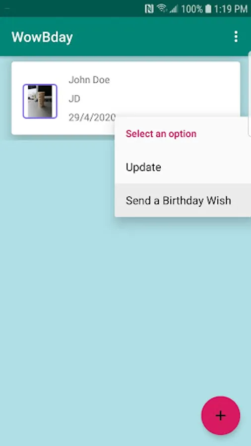 WowBday is a simple application that helps user to set a notification birthday reminder and to send a birthday wish using messaging application. WowBday has features that allow user to import the information from device Contacts or to add the information through the provided user interface manually. WowBday also provides the birthday wish template, and it also provides a user interface where user can add or edit the birthday wish template.