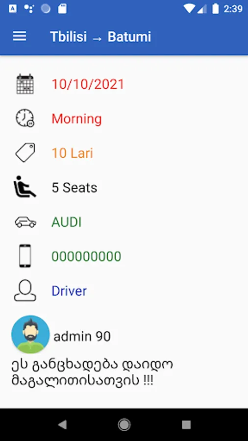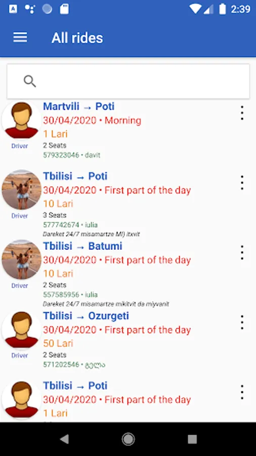 This app will allow users to check rides, add rides and manage their rides. App will allow to contact with drivers or passengers. App supports Georgian and English languages.