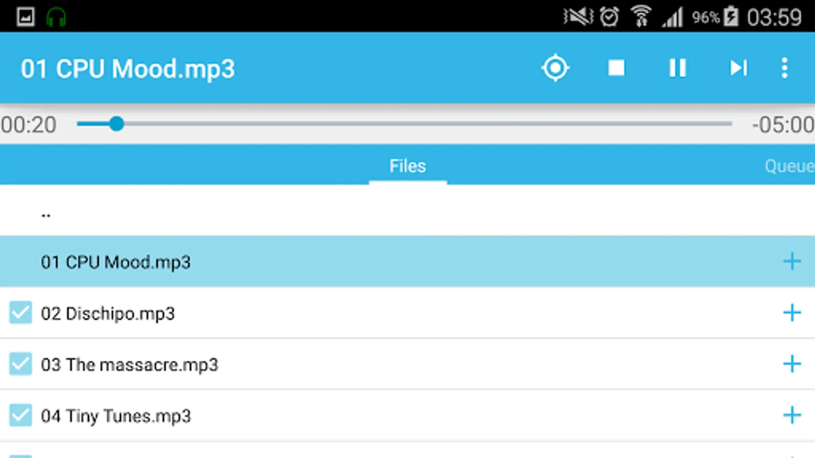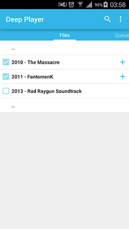 • touch a 'plus' button to add checked files/folders to the end of queue, or long touch the button to add it after the current file.