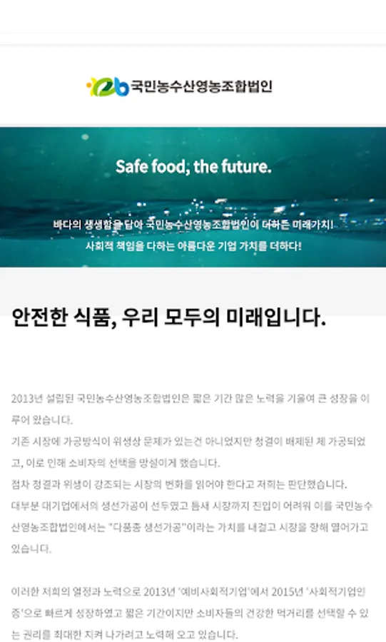 이러한 저희의 열정과 노력으로 2013년 '예비사회적기업'에서 2015년 '사회적기업인증'으로 빠르게 성장하였고 짧은 기간이지만 소비자들의 건강한 먹거리를 선택할 수 있는 권리를 최대한 지켜 나가려고 노력해 오고 있습니다.