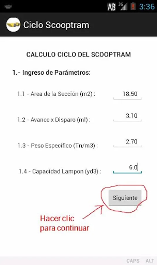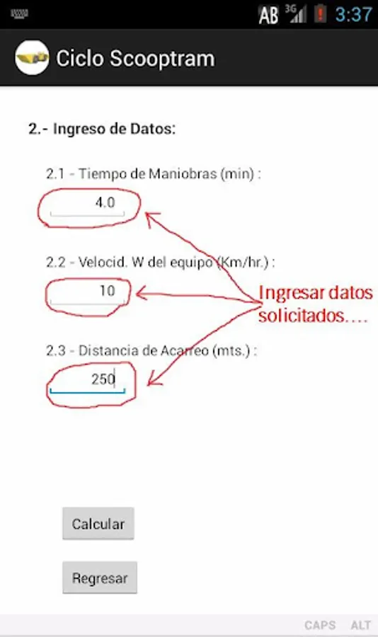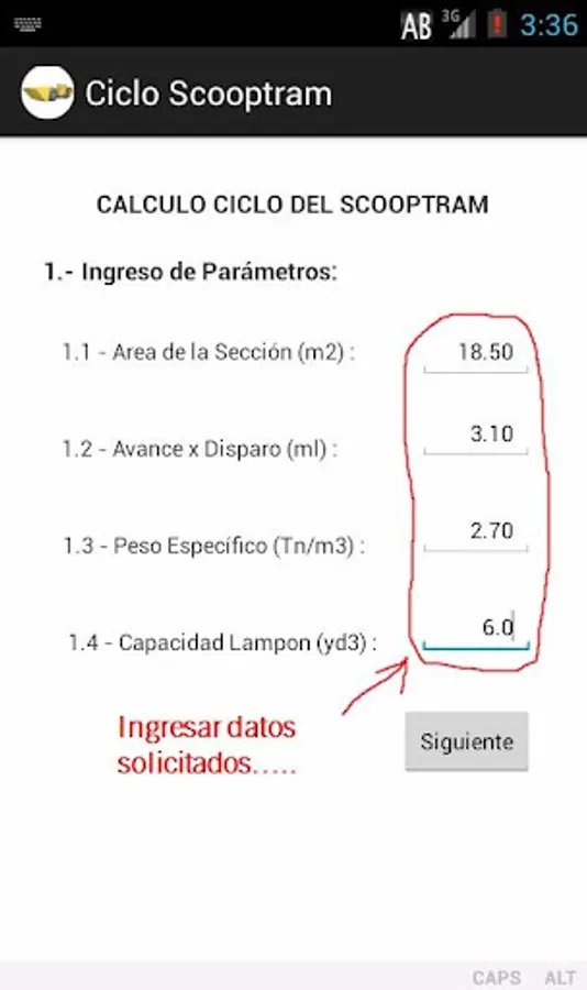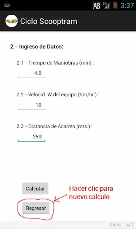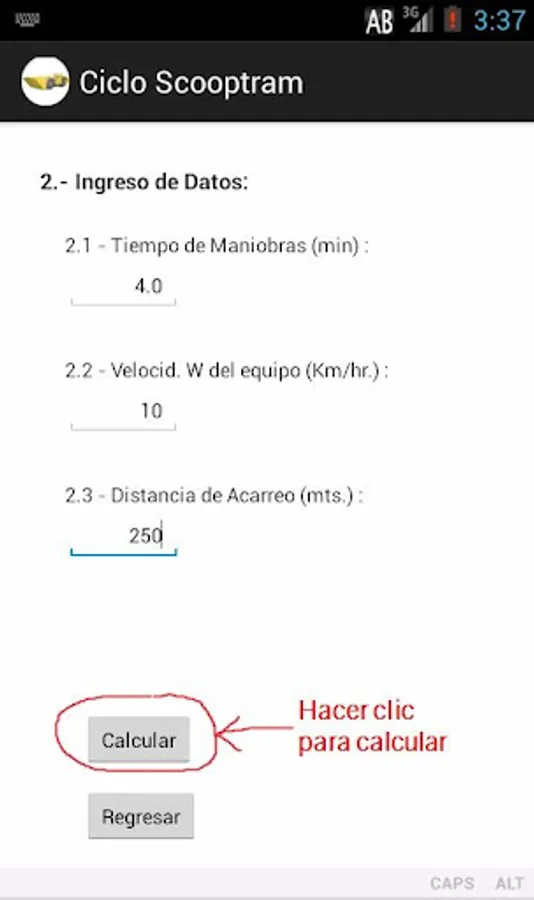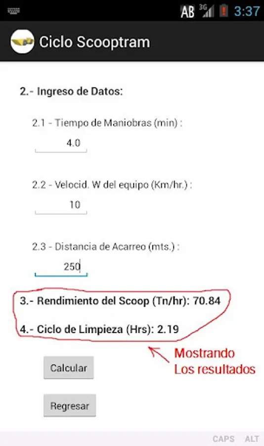 Calculates scooptram performance (low-profile charger used in underground mining work) knowing the 7 main variables to determine the duty cycle, these are: (1) section excavated area, (2) advancing by shooting ( 3) specific weight of excavated material, (4) ability scooptram lampón or spoon, (5) while maneuvering (6) Average travel speed (7) distance haulage. Scooptram returns performance in tonnes per hour and the front cleaning cycle in hours.