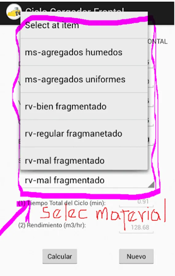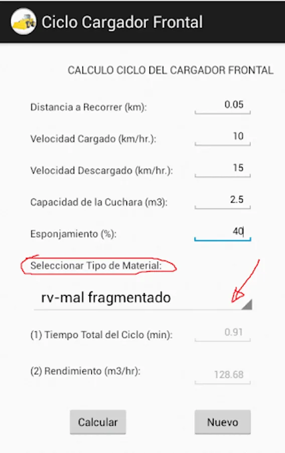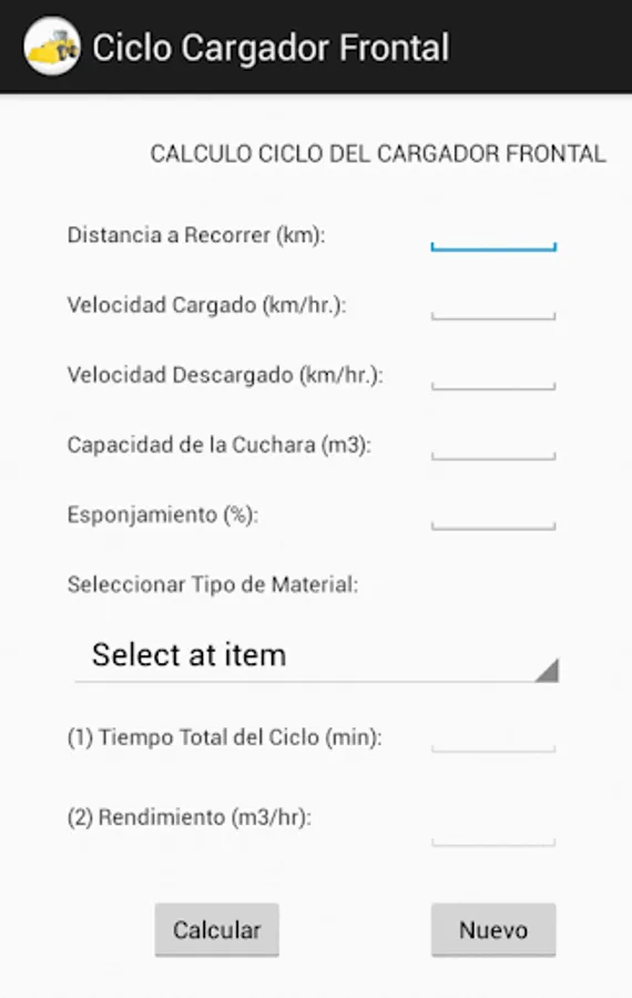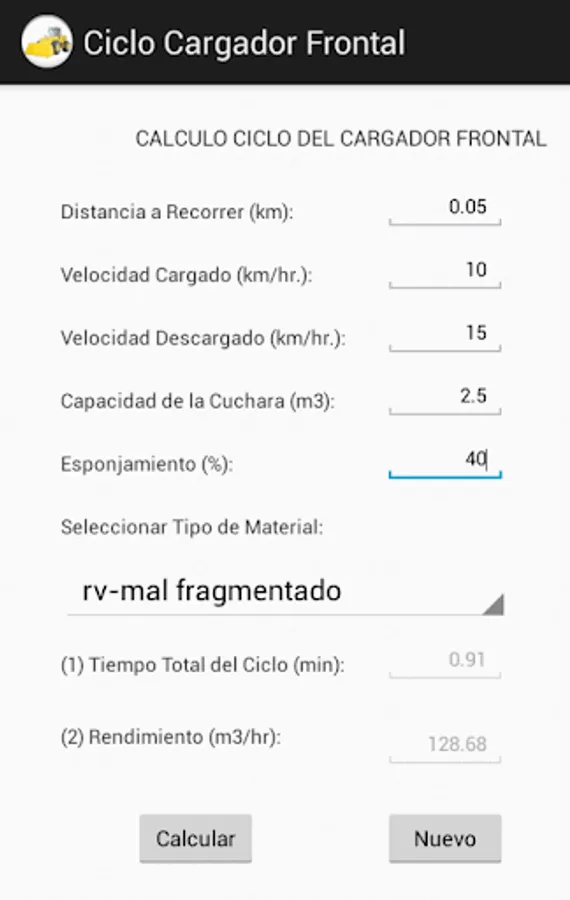 To calculate the performance front loader knowing the 6 main variables to determine the duty cycle, these are (1) the distance traveled in kilometers, (2) the rate charged and (3) discharged from the equipment km / hr ( 4) the ability of the spoon or lampón in m3, (5) the swelling factor of the material in% and (6) the type of material being transferred. Returns the total cycle time in minutes and work performance m3 / hr.