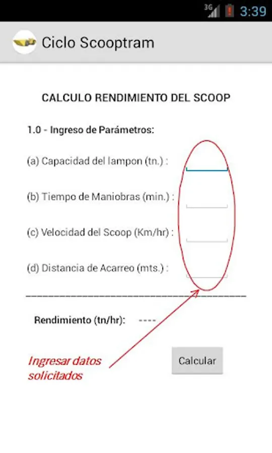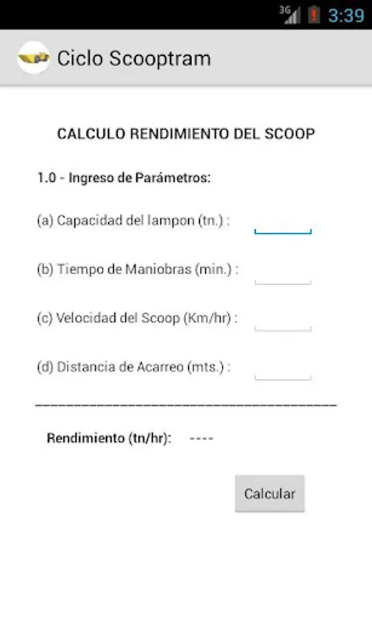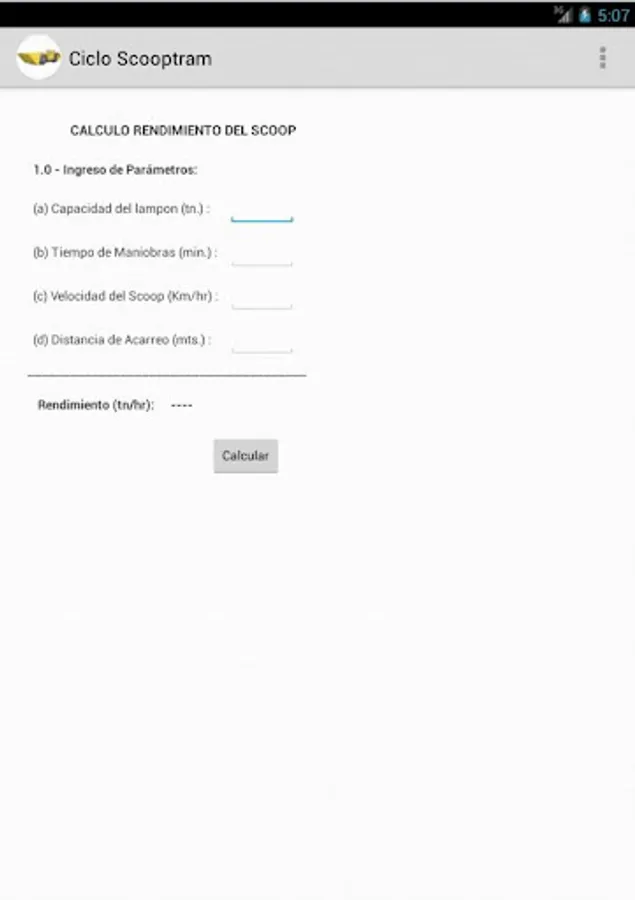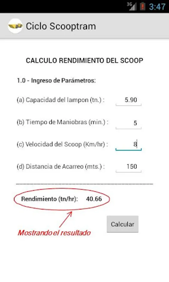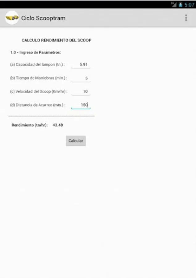 Calculates scooptram performance (low-profile charger used in underground mining work) knowing the 4 main variables these are: (1) ability lampon or spoon in tonnes, (2) while maneuvering in minutes, (3) scooptram working speed, expressed in kilometers per hour, and (4) haulage distance in meters. Returns scooptram performance expressed in tons per hour.