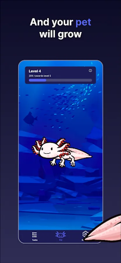 2. Virtual Pet Care: Meet your very own virtual pet axolotl! Begin with a small, adorable axolotl that grows and thrives as you complete tasks and earn points. Nurture it daily for maximum cuteness!