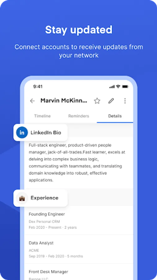 - Connect your LinkedIn account and keep Dex up-to-date with your connections.