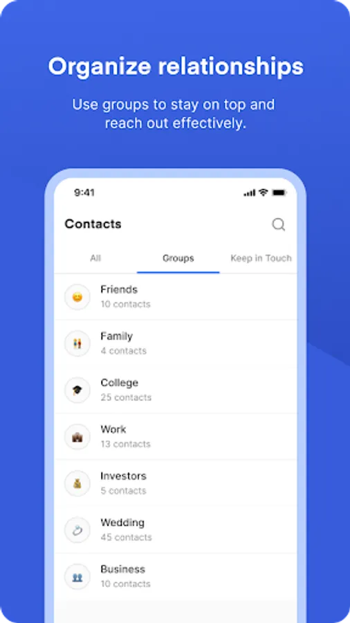 - Organize all your relationships with groups, custom tags, and views.