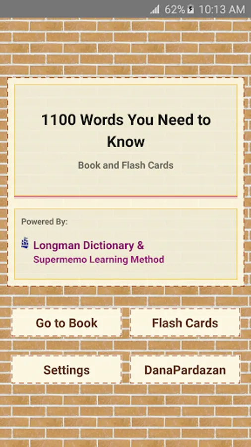 ● This application has two main parts, 'Book' and 'Flash Cards'. In the Book section you can go through all the words and study them as you like and the Flash Card section helps you to memorize words using 'Supermemo' learning method.