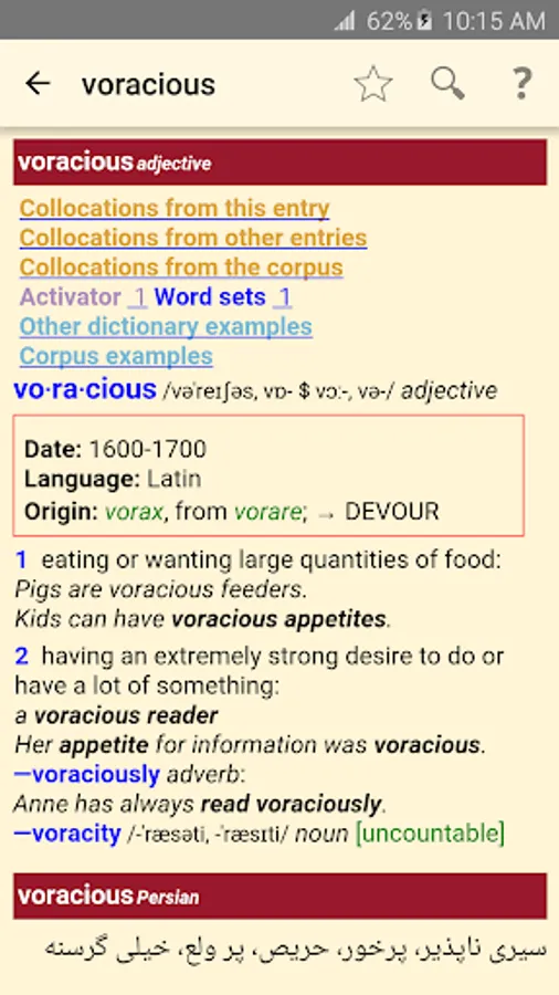 ● You can listen to the pronunciation of each word, its definition and examples by simply clicking on them (Note that for hearing audio pronunciations, the ‘Text to Speech’ feature of your phone should be activated).