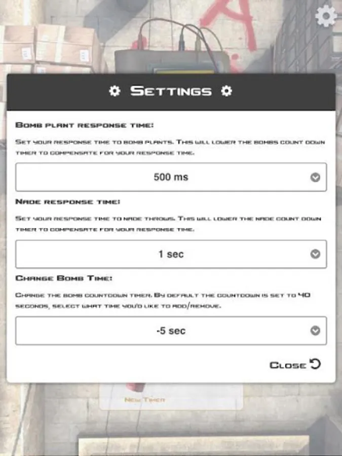 Whenever you hear a smoke or fire bomb land which you'd like to monitor, tap on the corresponding button and a count down will begin.