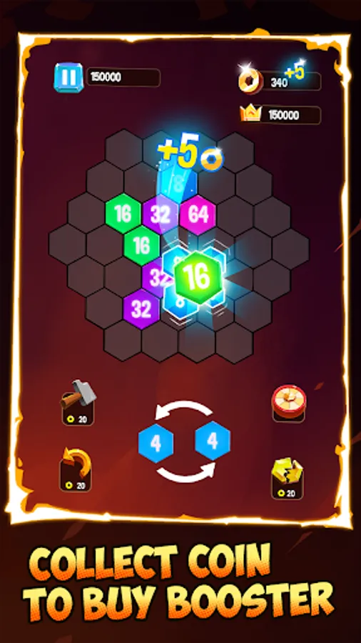 * Match over than 3 same number blocks to speed up and collect coin: Merge 3 of "2" blocks -> "4" block, Merge 4 of "2" blocks -> "8" block, merge 5 of "2" blocks -> "16" block ...