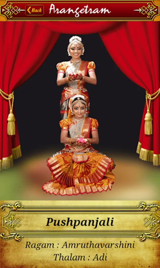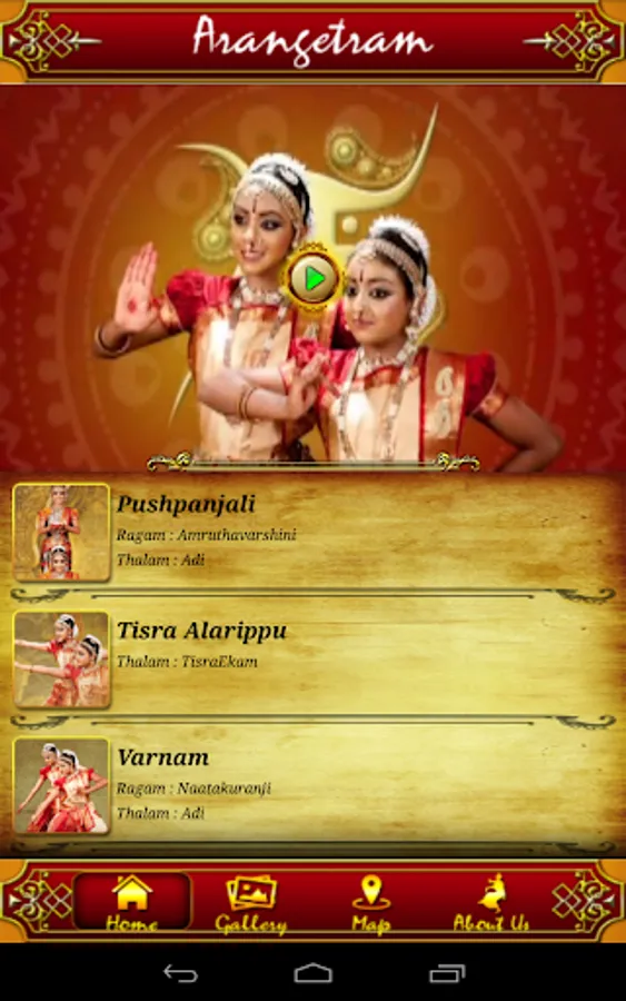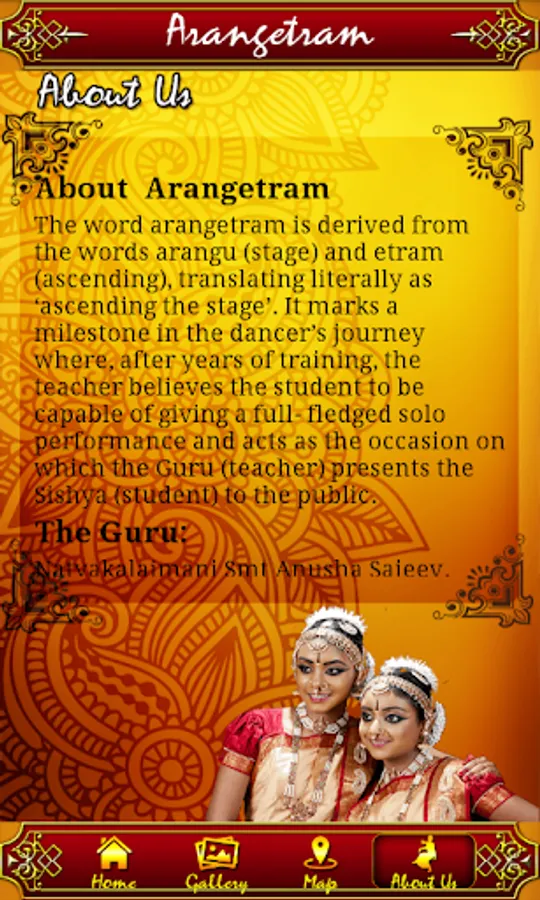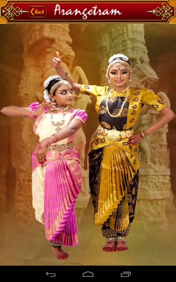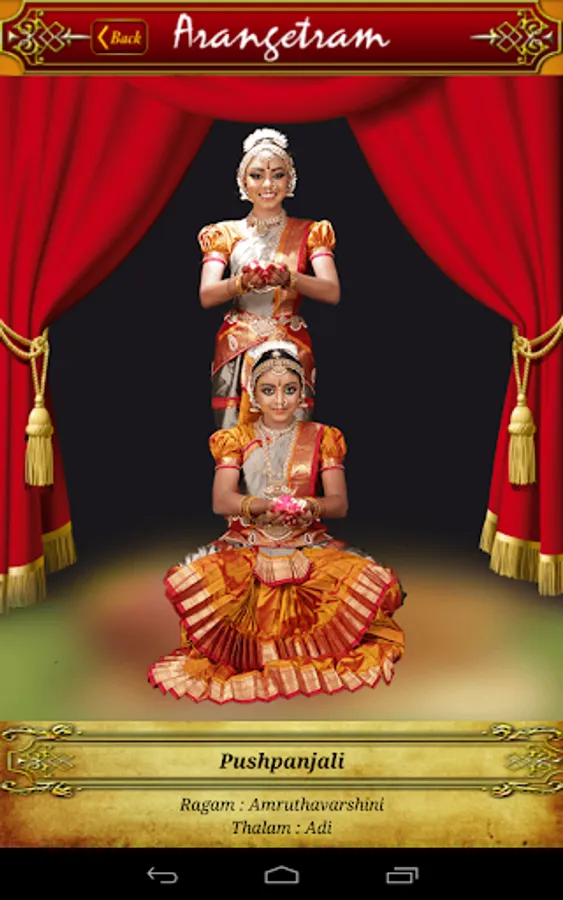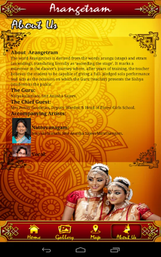 This App mainly focus on the South Indian traditional Dance performance which is going to be performed by Amara and Anika in their Bharatanatyam Arangetram. This app not only exhibits their talent but this app also contains the location sensors so that the Users can track the direction of the event from their current place. This app shows the Users about the different forms of Dance they are performing, their Dance images and their Guru's and Musicians who are also going to participate in the event. Bharata Natyam is an indian dance form renowned from Vedic ages.