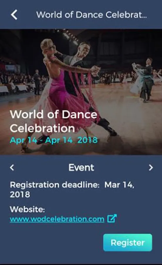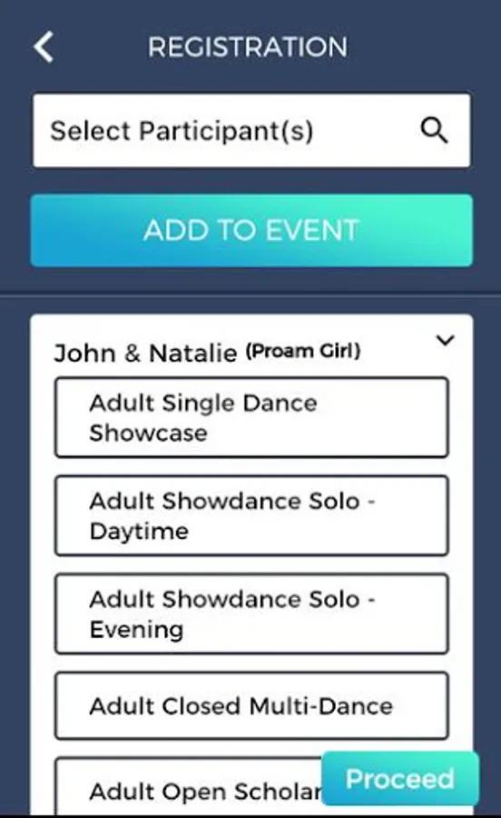 • YOUR PERSONAL PROFILE: Set this up once, and only once when you first use BallroomGO. It knows your important information required for registering at competitions; no longer do you have to enter the same information multiple times for the same event, or for different events.