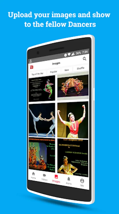 Images: This section lets users see the images uploaded by other users. A user can filter the images based upon their popularity, Top of the Day, New and can shuffle.